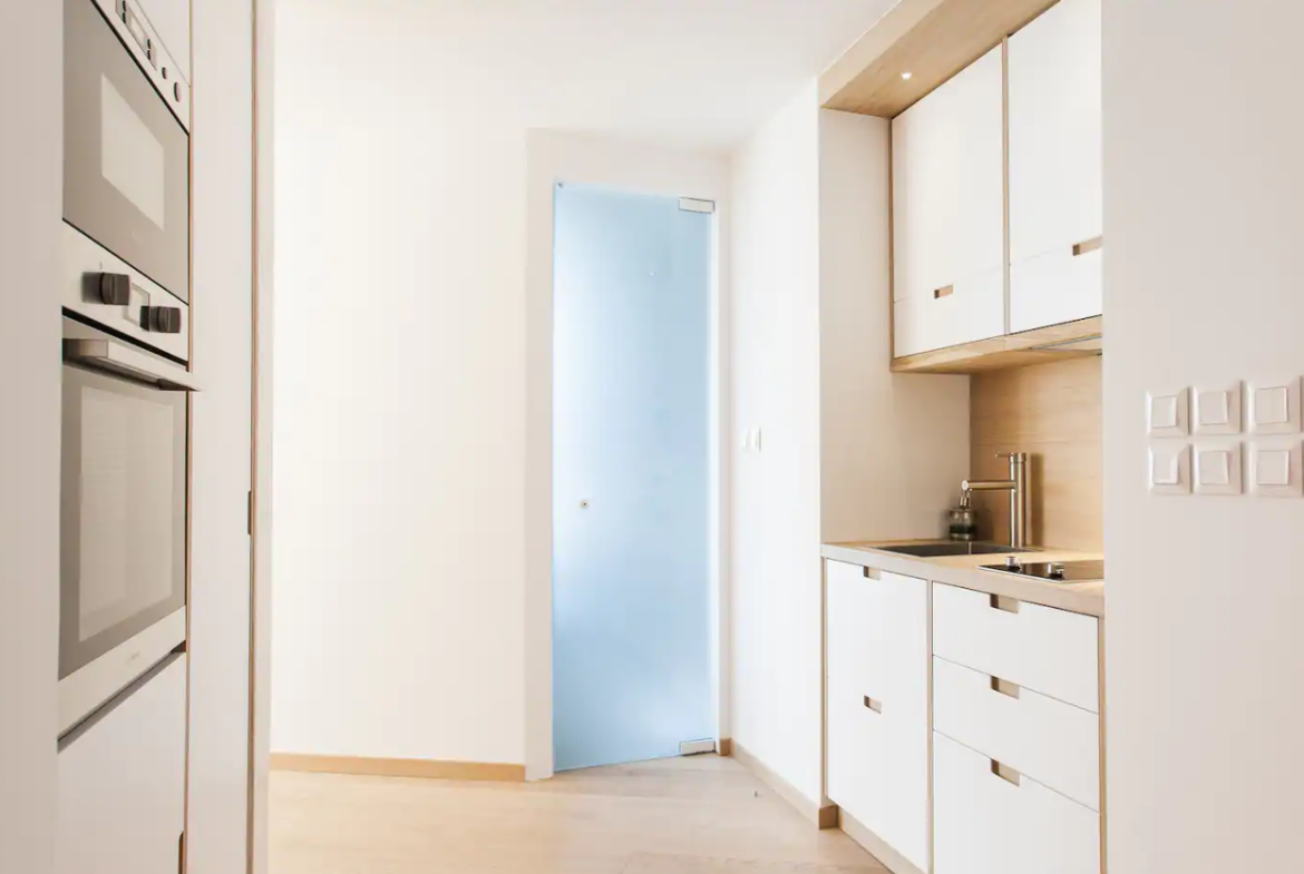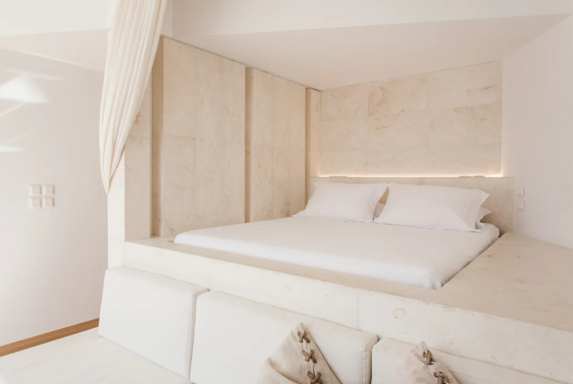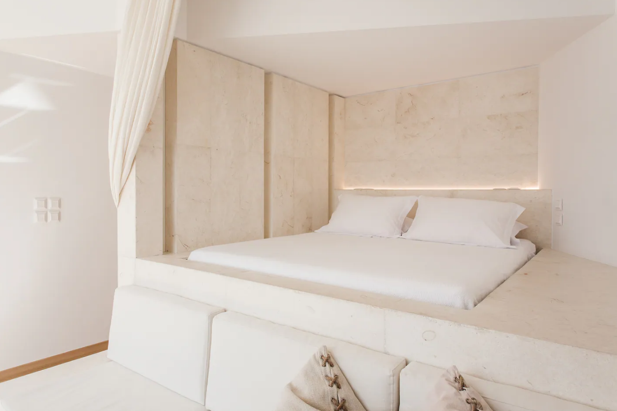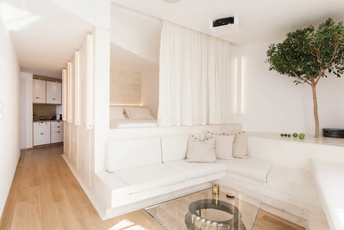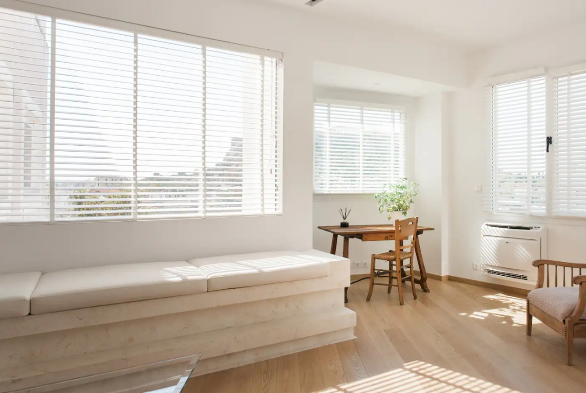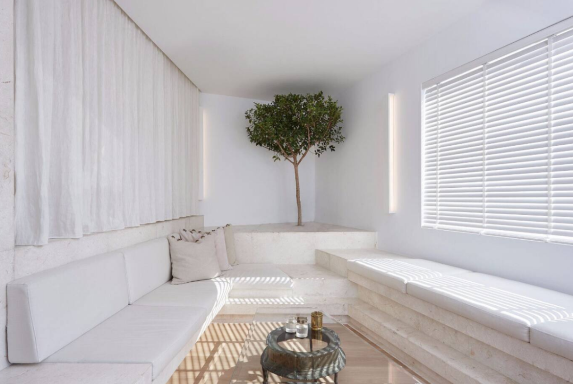 • Open-plan living area with large windows and neutral finishes for a bright, airy feel